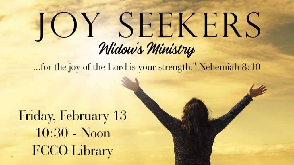 If you’re a new widow or one who is still traversing the healing process of widowhood please join us on the second Friday of each month from 10:30 to noon in the library at FCCO.